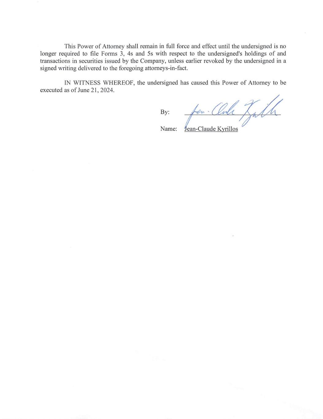 | /s/ Rachel Malina, Attorney-in-Fact for Jean-Claude Kyrillos | 06/26/2024 | |