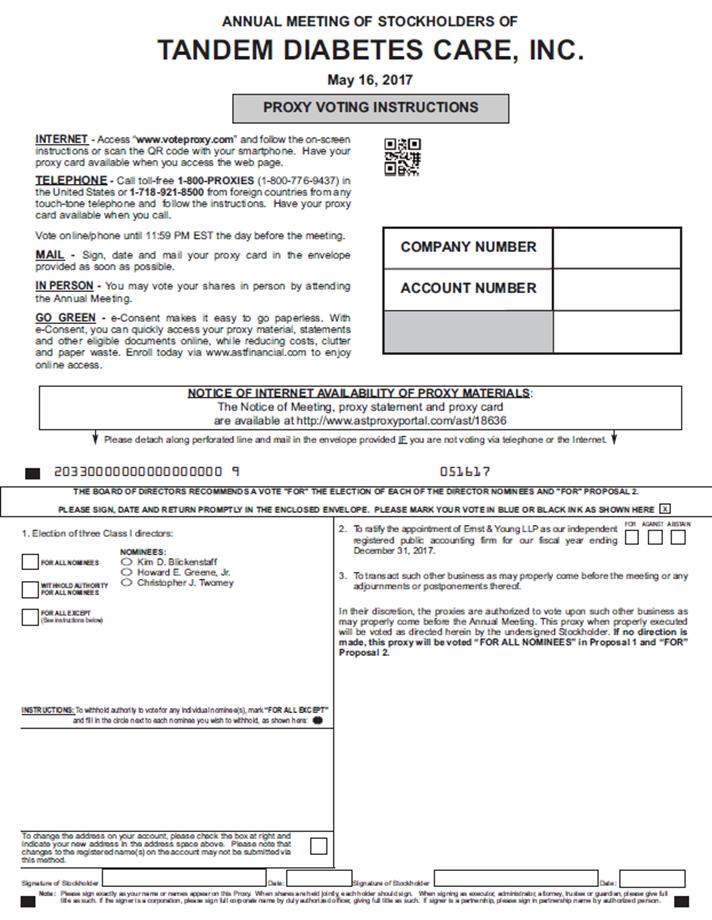 Signature of Stockholder Date: Signature of Stockholder Date:Note: Please sign exactly as your name or names appear on this Proxy. When shares are held jointly, each holder should sign. When signing as executor, administrator, attorney, trustee or guardian, please give fulltitle as such. If the signer is a corporation, please sign full corporate name by duly authorized officer, giving full title as such. If signer is a partnership, please sign in partnership name by authorized person.To change the address on your account, please check the box at right andindicate your new address in the address space above. Please note thatchanges to the registered name(s) on the account may not be submitted viathis method.1. Election of three Class I directors:O Kim D. BlickenstaffO Howard E. Greene, Jr.O Christopher J. Twomey2. To ratify the appointment of Ernst & Young LLP as our independentregistered public accounting firm for our fiscal year endingDecember 31, 2017.3. To transact such other business as may properly come before the meeting or anyadjournments or postponements thereof.In their discretion, the proxies are authorized to vote upon such other business asmay properly come before the Annual Meeting. This proxy when properly executedwill be voted as directed herein by the undersigned Stockholder. if no direction ismade, this proxy will be voted “fOR all NOmiNEEs” in proposal 1 and “fOR”proposal 2.FOR AGAINST ABSTAINFOR ALL NOMINEESWITHHOLD AUTHORITYFOR ALL NOMINEESFOR ALL EXCEPT(See instructions below)INSTRUCTIONS: To withhold authority to vote for any individual nominee(s), mark “FOR ALL EXCEPT”and fill in the circle next to each nominee you wish to withhold, as shown here:JOhN smiTh1234 maiN sTREETapT. 203NEW YORK, NY 10038NOmiNEEs:aNNUal mEETiNG Of sTOcKhOldERs OfTaNdEm diaBETEs caRE, iNc.may 16, 2017iNTERNET - Access “www.voteproxy.com” and follow the on-screeninstructions or scan the QR code with your smartphone. Have yourproxy card available when you access the web page.TElEphONE - Call toll-free 1-800-pROXiEs (1-800-776-9437) inthe United States or 1-718-921-8500 from foreign countries from anytouch-tone telephone and follow the instructions. Have your proxycard available when you call.Vote online/phone until 11:59 PM EST the day before the meeting.mail - Sign, date and mail your proxy card in the envelopeprovided as soon as possible.iN pERsON - You may vote your shares in person by attendingthe Annual Meeting.GO GREEN - e-Consent makes it easy to go paperless. Withe-Consent, you can quickly access your proxy material, statementsand other eligible documents online, while reducing costs, clutterand paper waste. Enroll today via www.astfinancial.com to enjoyonline access.pROXY vOTiNG iNsTRUcTiONsPlease detach along perforated line and mail in the envelope provided IF you are not voting via telephone or the Internet.ThE BOaRd Of diREcTORs REcOmmENds a vOTE "fOR" ThE ElEcTiON Of Each Of ThE diREcTOR NOmiNEEs aNd "fOR" pROpOsal 2.plEasE siGN, daTE aNd RETURN pROmpTlY iN ThE ENclOsEd ENvElOpE. plEasE maRK YOUR vOTE iN BlUE OR BlacK iNK as shOWN hERE x------------------ ----------------20330000000000000000 9 051617cOmpaNY NUmBERaccOUNT NUmBERNOTicE Of iNTERNET availaBiliTY Of pROXY maTERials:The Notice of Meeting, proxy statement and proxy cardare available at http://www.astproxyportal.com/ast/18636