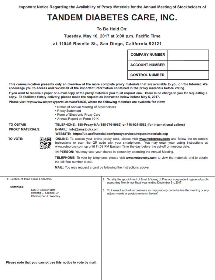 1. Election of three Class I directors:Kim D. BlickenstaffHoward E. Greene, Jr.Christopher J. Twomey2. To ratify the appointment of Ernst & Young LLP as our independent registered publicaccounting firm for our fiscal year ending December 31, 2017.3. To transact such other business as may properly come before the meeting or anyadjournments or postponements thereof.nomineeS:important notice regarding the availability of Proxy materials for the annual meeting of Stockholders oftanDem DiaBeteS Care, inC.to Be held on:tuesday, may 16, 2017 at 3:00 p.m. Pacific timeat 11045 roselle St., San Diego, California 92121this communication presents only an overview of the more complete proxy materials that are available to you on the internet. weencourage you to access and review all of the important information contained in the proxy materials before voting.if you want to receive a paper or e-mail copy of the proxy materials you must request one. there is no charge to you for requesting acopy. to facilitate timely delivery, please make the request as instructed below before may 5, 2017.Please visit http://www.astproxyportal.com/ast/18636, where the following materials are available for view:• Notice of Annual Meeting of Stockholders• Proxy Statement• Form of Electronic Proxy Card• Annual Report on Form 10-Kto oBtain teLePhone: 888-Proxy-na (888-776-9962) or 718-921-8562 (for international callers)ProXY materiaLS: e-maiL: info@amstock.comweBSite: https://us.astfinancial.com/proxyservices/requestmaterials.aspto Vote: onLine: To access your online proxy card, please visit www.voteproxy.com and follow the on-screeninstructions or scan the QR code with your smartphone. You may enter your voting instructions atwww.voteproxy.com up until 11:59 PM Eastern Time the day before the cut-off or meeting date.in PerSon: You may vote your shares in person by attending the Annual Meeting.teLePhone: To vote by telephone, please visit www.voteproxy.com to view the materials and to obtainthe toll free number to call.maiL: You may request a card by following the instructions above.ComPanY nUmBeraCCoUnt nUmBerControL nUmBerJohn Smith1234 main StreetaPt. 203new York, nY 10038Please note that you cannot use this notice to vote by mail.