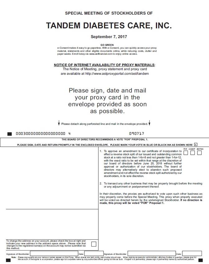 Special meeting of stockholders of tandem diabetes care, inc. September 7, 2017 go green e-consent makes it easy to go paperless. With e-consent, you can quickly access your proxy material, statements and other eligible documents online, while reducing costs, clutter and paper waste. Enroll today via ww.astfinancial.com to enjoy online access. Notice of internet availability of proxy materials: the notice of meeting, proxy statement and proxy card are available at http://astproxyportal.com/ast/tandem please sign, date and mail your proxy card in the envelope provided as soon as possible. Please detach along perforated line and mail in the envelope provided. 00030000000000000000 4 090717 the board of directors recommends a vote “for” proposal 1. Please sign, date and return promptly in the enclosed envelope. Please mark your vote in blue or black ink as shown here 1. To approve an amendment to our certificate of incorporation to effect a reverse stock split of our issued and outstanding common stock at a ratio not less than 1-for-8 and not greater than 1-for-12, with the exact ratio to be set within that range at the discretion of our board of our board of directors before june 20, 2018 without further approval or authorization of our stockholders. The board of directors may alternatively elect to abandon such proposed amendment and not effect the reverse stock split authorized by our stockholders, in its sole discretion. 2. To transact any other business that may be properly brought before the meeting or any adjournment or postponement thereof. In their discretion, the proxies are authorized to vote upon such other business as may properly come before the special meeting. This proxy when properly executed will be voted as directed herein by the undersigned stockholder. If no direction is made, this proxy will be voted “for” proposal 1. To change the address on our account, please check the box at right and indicate your new address in the address space above. Please note that changes to the registered name(s) on the account may not be submitted via this method. Signature of stockholder date: note please sign exactly as your name of names appear on this proxy. When shares are held jointly, each holder should sign. When signing as executor, administrator, attorney trustee or guardian, please give full title as such. If the signer is a corporation, please sign full corporate name by duly authorized officer, giving full title as such. If signer is a partnership, please sign in partnership name by authorized person.